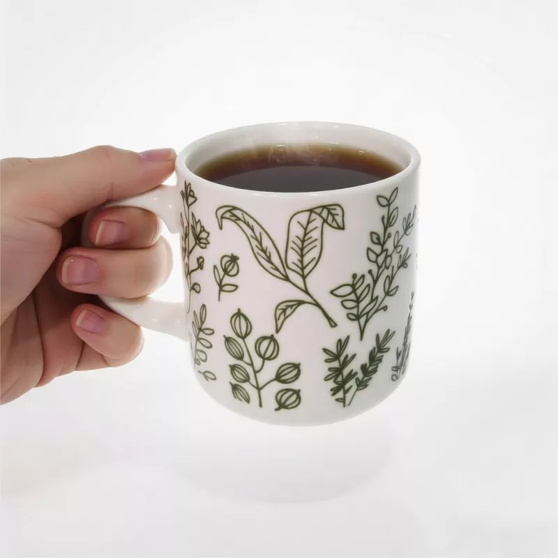 1. Nagtatampok ang mug na ito ng simple at natural na green botanical print bilang visual centerpiece nito:
