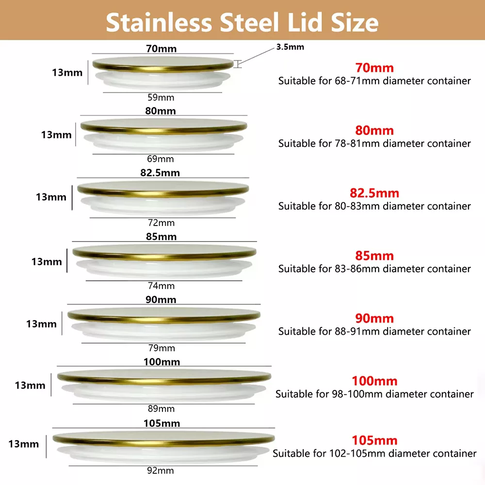 Ang aming screen sa pag -print ng hindi kinakalawang na asero kandila jar lids ay magagamit sa iba't ibang laki, lahat na may pangkalahatang taas ng 13mm. Ang mga tukoy na sukat at katugmang pagbubukas ng lalagyan ay ipinapakita sa ibaba: